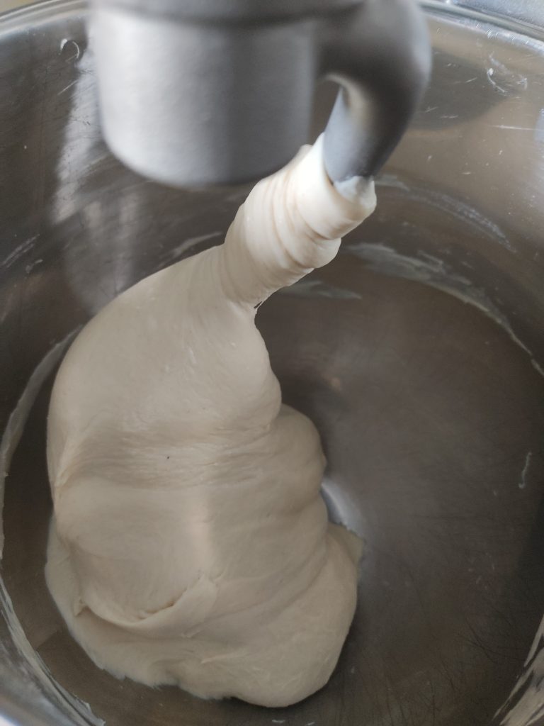 • Jetzt erst das Salz hinzufügen. Den Teig 5 Minuten auf schnellerer Stufe (1-2 Stufen höher stellen) fertig kneten. Dabei auch die Butter stückchenweise einarbeiten, bis sie gut im Teig aufgenommen ist.