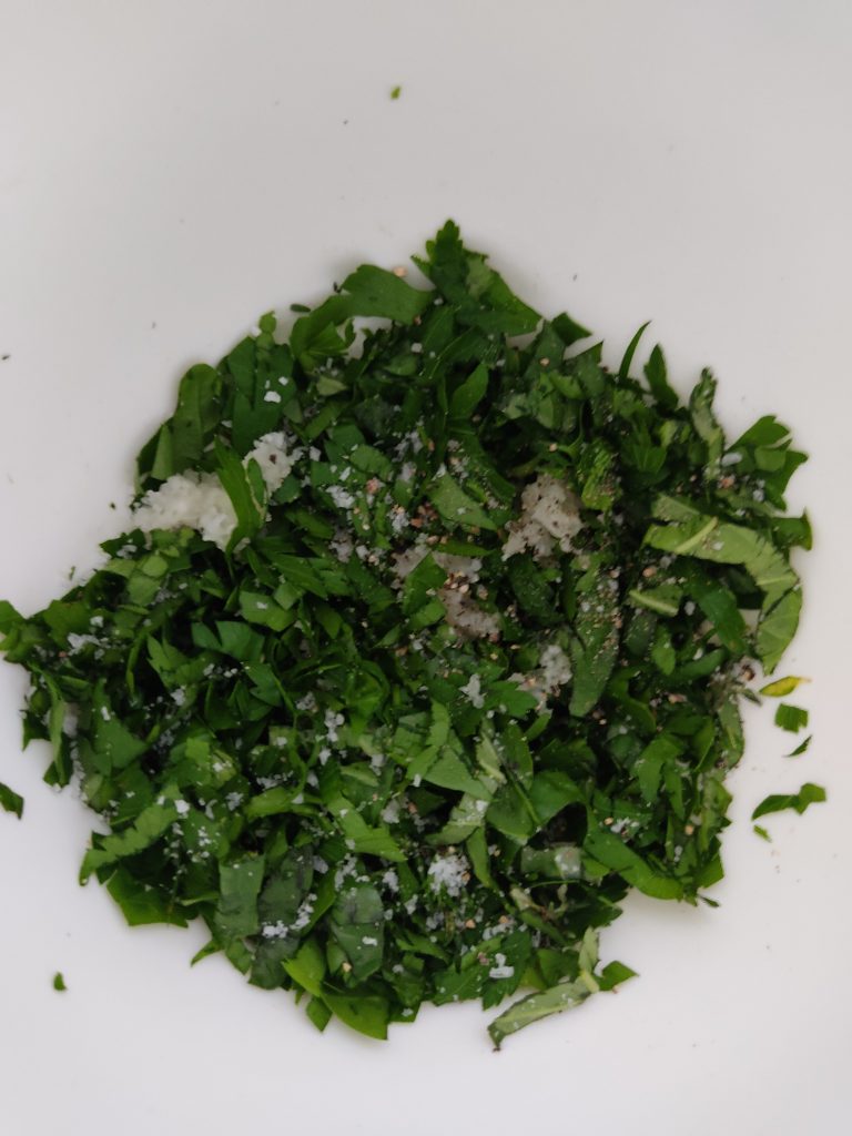 • Kräuter wie in Zutaten beschrieben vorbereiten. Etwas Salz und Pfeffer dazu geben.