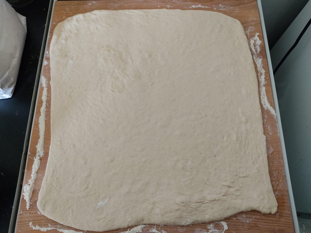 • Teig auf einer bemehlten Arbeitsfläche zu einem Recheck ausrollen (ca. 40 x 40 cm). Bitte behutsam und ohne großen Druck auf den Teig auszuüben.