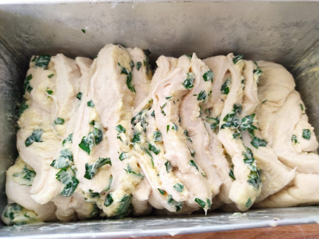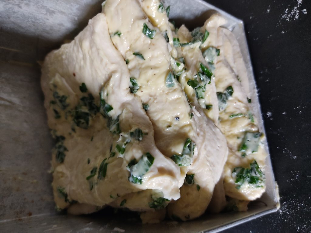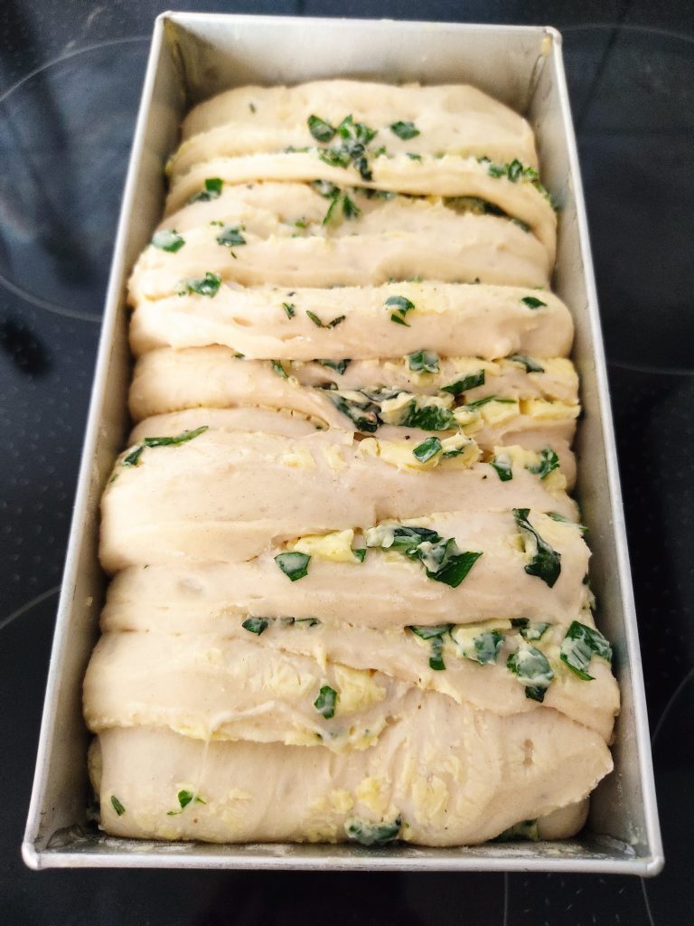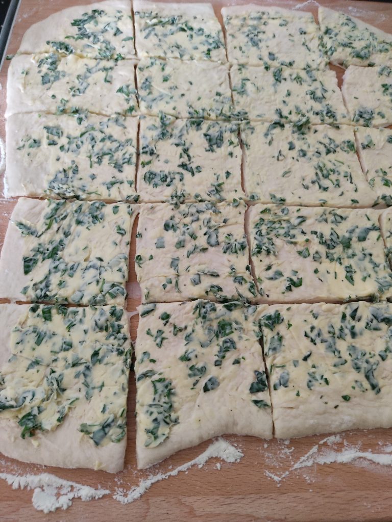 • Die weiche Kräuterbutter auf dem Teig gleichmäßig verteilen. Die Teigplatte in gleichmäßige Quadrate schneiden (je nach Größe eurer Kastenform).