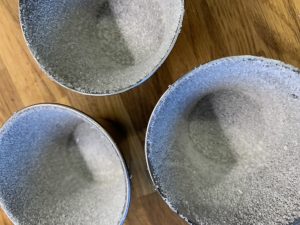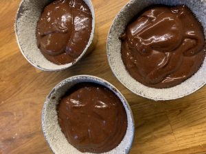 Die Förmchen zu ca. 3/4 mit der Schokomasse füllen. Im heißen Backofen backen: in Keramikschalen 11 Minuten / in Flan-Schalen: 8 Minuten 40 Sekunden