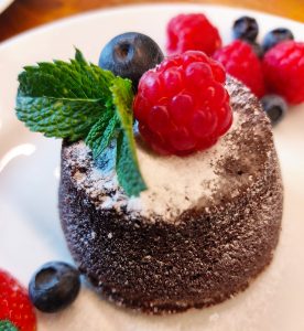 Anschließend die Chocolat Malheur vorsichtig auf einen Teller stürzen, mit Puderzucker bestreuen und nach Belieben garnieren.